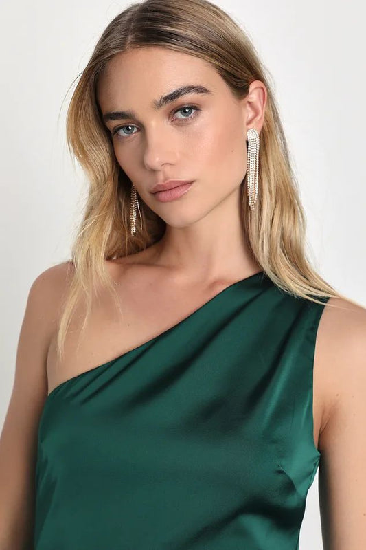 Love Me Tonight Emerald Green Satin One-Shoulder Mini DresS