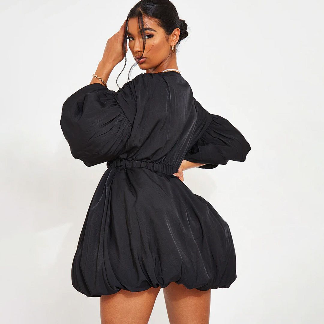 Add some drama to your new season look with this shift dress. Featuring a black material with puff sleeves and a puffball hem design. Team this effortlessly with slides and a shoulder bag for an insta-worthy vibe